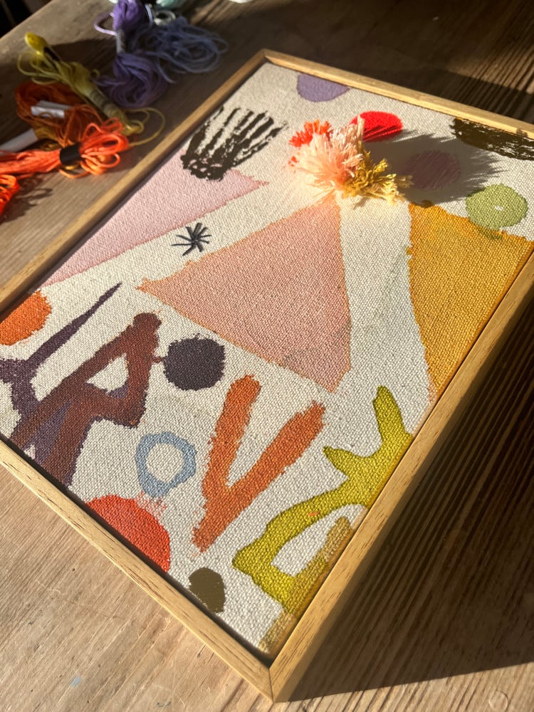 Each one is an original painting. Created in acrylic paint, hand embroidery and gold foil on raw canvas, hand stretched and framed in a wax obeche simple box frame.